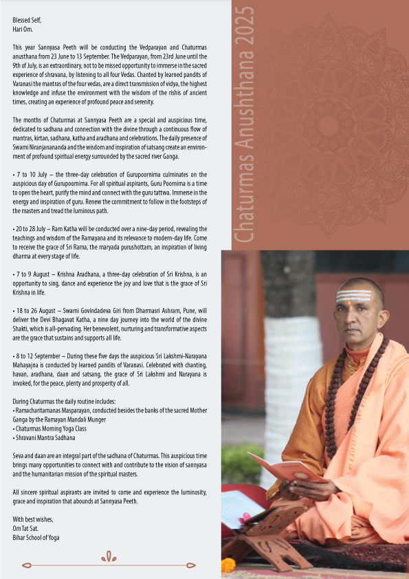 The months of Chaturmas at Sannyasa Peeth are a special and auspicious time, dedicated to sadhana and connection with the divine through a continuous flow of mantras, kirtan, sadhana, katha and aradhana and celebrations. The daily presence of Swami Niranjanananda and the wisdom and inspiration of satsang create an environment of profound spiritual energy surrounded by the sacred river Ganga.