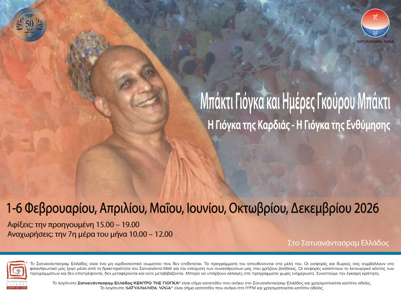 Τις ημέρες 4, 5 και 6 του μήνα το πρόγραμμα Guru Bhakti Yoga - Η Γιόγκα της Ενθύμησης αφιερώνεται στον Sri Swami Satyananda Saraswati, έναν μεγάλο φωτεινό δάσκαλο της γιόγκα που, μέσω του αδιάκοπου και ανιδιοτελούς έργου του, διέδωσε τις αρχαίες πρακτικές της γιόγκα σε όλο τον κόσμο αγγίζοντας τις καρδιές χιλιάδων ανθρώπων, μεταμορφώνοντας τις ζωές τους και ανυψώνοντας το πνεύμα τους μέσα από τις διδασκαλίες του.