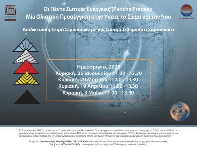 Οι Πέντε Πράνα (Pancha Pranas) Ολιστική Προσέγγιση στην Υγεία, το Σώμα και τον Νου Σειρά Διαδικτυακών Σεμιναρίων με τη Σουάμι Σιβαμούρτι Σαρασουάτι Ημερομηνίες 2026: 25 Ιανουαρίου · 29 Μαρτίου · 19 Απριλίου · 3 Μαΐου Ώρα: 11:00 – 13:30 Πρώτη Συνεδρία: Κυριακή, 25 Ιανουαρίου Σχετικά με τη Σειρά Όλη η ύπαρξη συντηρείται…